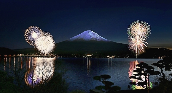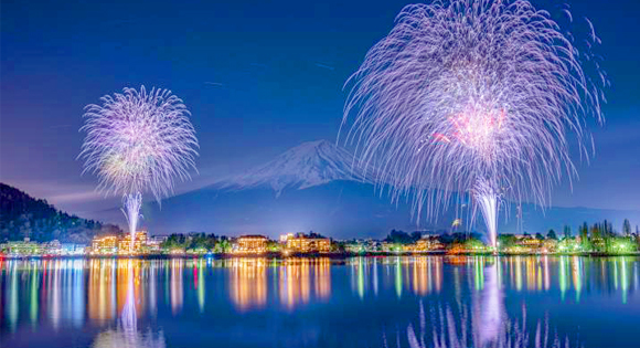 風もなく、湖面が穏やかな時には、河口湖に映る「逆さ花火」もきれいに見ることができます。